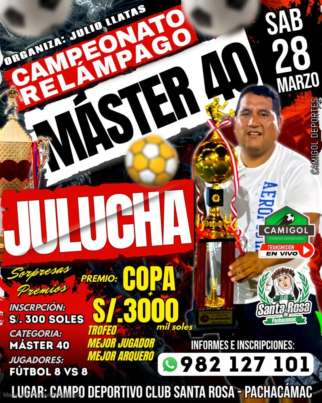Atención bravos del fútbol! ⚽🔥 A desempolvar los chimpunes que se viene el Relámpago MÁSTER 40 organizado por el gran "Julucha". Arma tu equipo para el Fútbol 8 vs 8. El campeón se lleva el jugoso premio de S/ 3,000 en efectivo + Copa 🏆💰, y además habrá trofeos para el mejor jugador y el mejor arquero del torneo. ¡Puro chocolate y calidad de la gentita de experiencia! Habrá sorpresas, premios y todo el torneo será transmitido en vivo por las pantallas de Camigol Deportes 🎥.