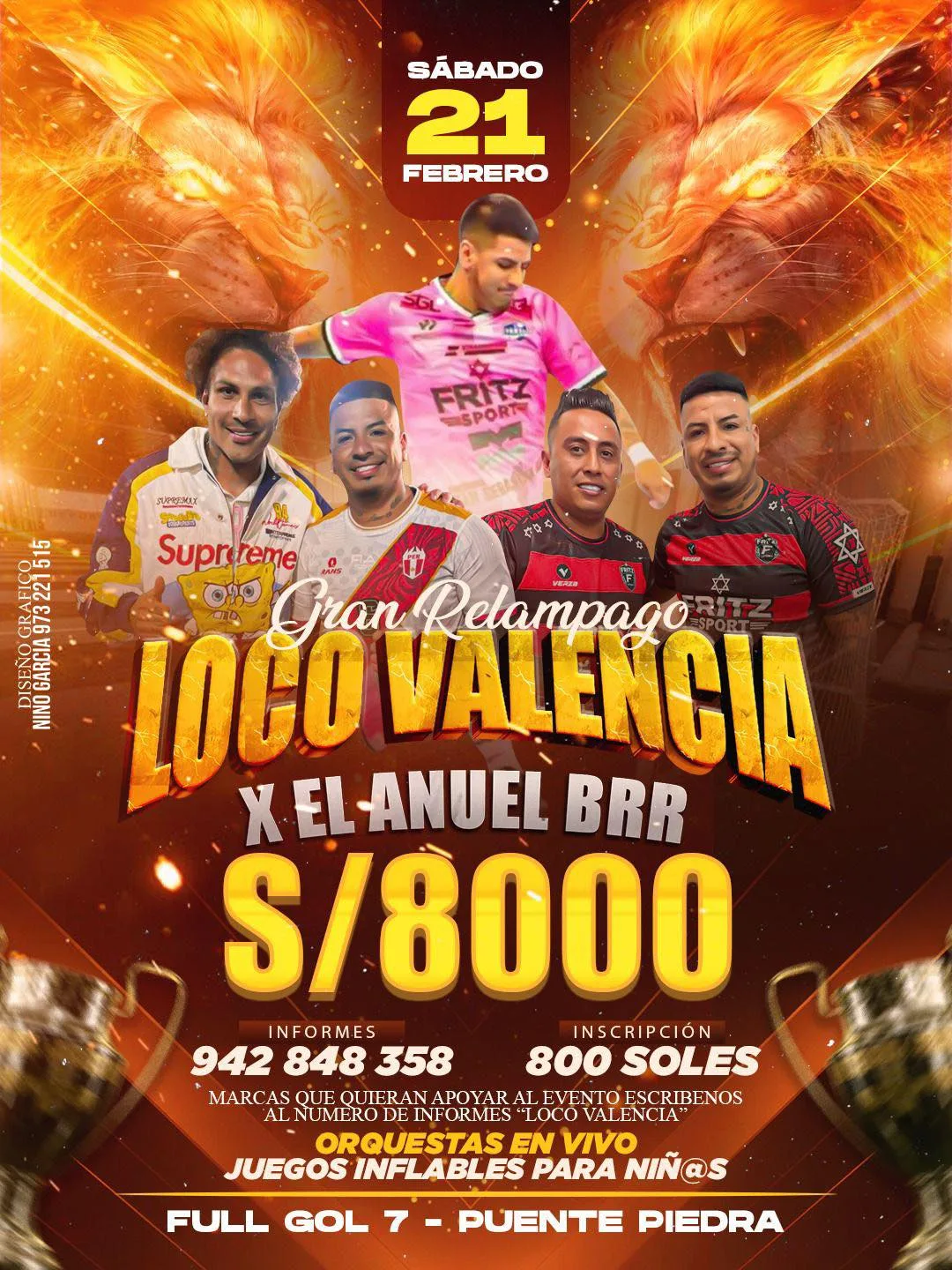 Este sábado 21 de febrero se viene el Gran Relámpago 🔥⚽ en Full Gol 7 (Puente Piedra), una fecha hecha para vivirla con intensidad de principio a fin. Habrá S/ 8,000 en premio 💰🏆 y un ambiente completo para ir con la familia: orquestas en vivo 🎶 y juegos inflables para niños 🎈👧🧒. Si estás por Lima Norte, es de esas jornadas que prometen partidazos y show. BRRR 🙌🔥