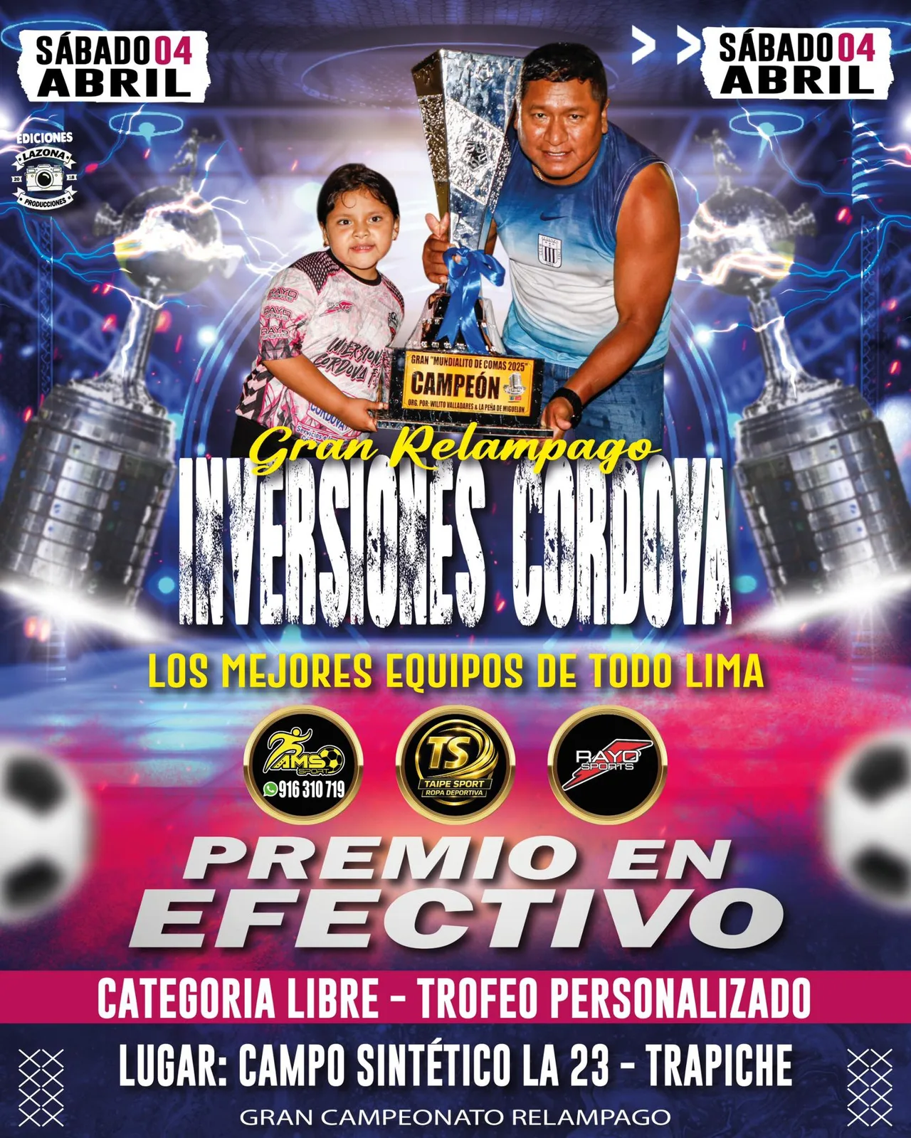 ¡Atención a todos los bravos de Lima, se viene una jornada de puro chocolate! ⚽🔥 Este sábado 04 de abril se paraliza la cancha con el Gran Relámpago Inversiones Cordova. La convocatoria está hecha para reunir a los mejores equipos de todo Lima, así que la competencia en la Categoría Libre va a estar recontra picante. Armen su mejor cuadro y bajen a sudar la camiseta, porque el equipo que logre la gloria se llevará a casa un buen Premio en Efectivo acompañado de un Trofeo Personalizado de lujo.