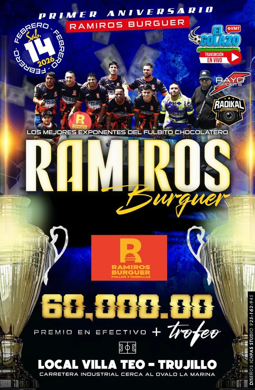 Este sábado 14 de febrero Trujillo se prende con el 1er aniversario de Ramiros Burguer 🔥🏆: un campeonato que reúne a los mejores exponentes del fulbito chocolatero, en Local VillaTeo (Carretera Industrial, cerca al Óvalo La Marina) ⚽💥. Se juega en categoría Libre y Máster, con S/ 60,000 en efectivo + trofeo para el campeón 💰🏆. Y para vivirlo completo, habrá transmisión en vivo por Golazo VMT 📱🎥, además de fotografía y reels a cargo de Radikal 📸🎬. Si estás en Trujillo o cerca, es una fecha grande para ir a ver partidazos y buen ambiente. 🔥🙌