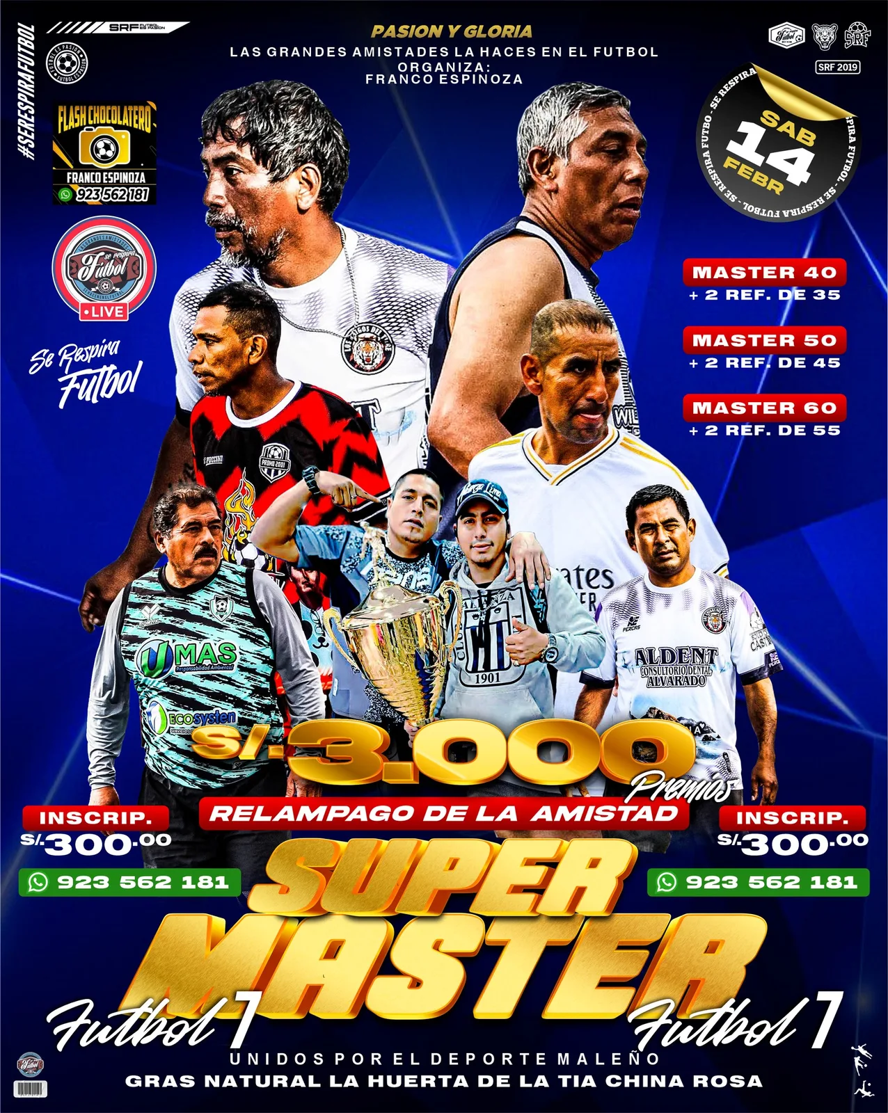 Este sábado 14 de febrero se juega el Súper Máster – Relámpago de la Amistad en Mala ⚽🤝, una fecha pensada para vivir buen fútbol entre patas y equipos de experiencia. El torneo se disputará en grass natural: La Huerta de la Tía China Rosa 🌿🏟️ y es organizado por Franco Espinoza. Habrá S/ 3,000 en premios 💰🔥 y se competirá en categorías Máster 40, 50 y 60 (con sus refuerzos según base) 🧓⚡. Además, podrás seguirlo con transmisión en vivo 📲🎥.