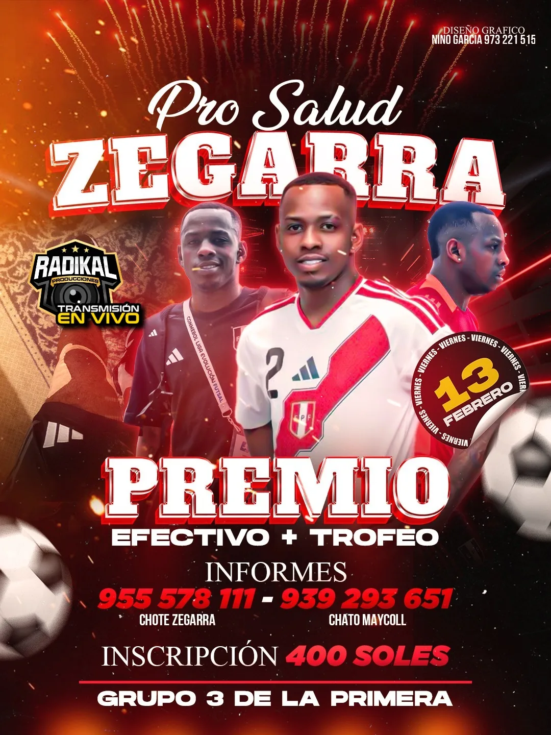 Este viernes 13 de febrero de 2026 se juega el Relámpago Pro Salud “Zegarra Chote” 🤝⚽, una fecha organizada con enfoque solidario para apoyar una causa de salud. La cita es en Grupo 3 de la Primera (V.E.S.), en categoría libre, con premio en efectivo + trofeo 🏆💰. Además, habrá regalo de camisetas y más sorpresas 🎁👕 para que la jornada se viva con buen fútbol y buen corazón. ❤️🔥